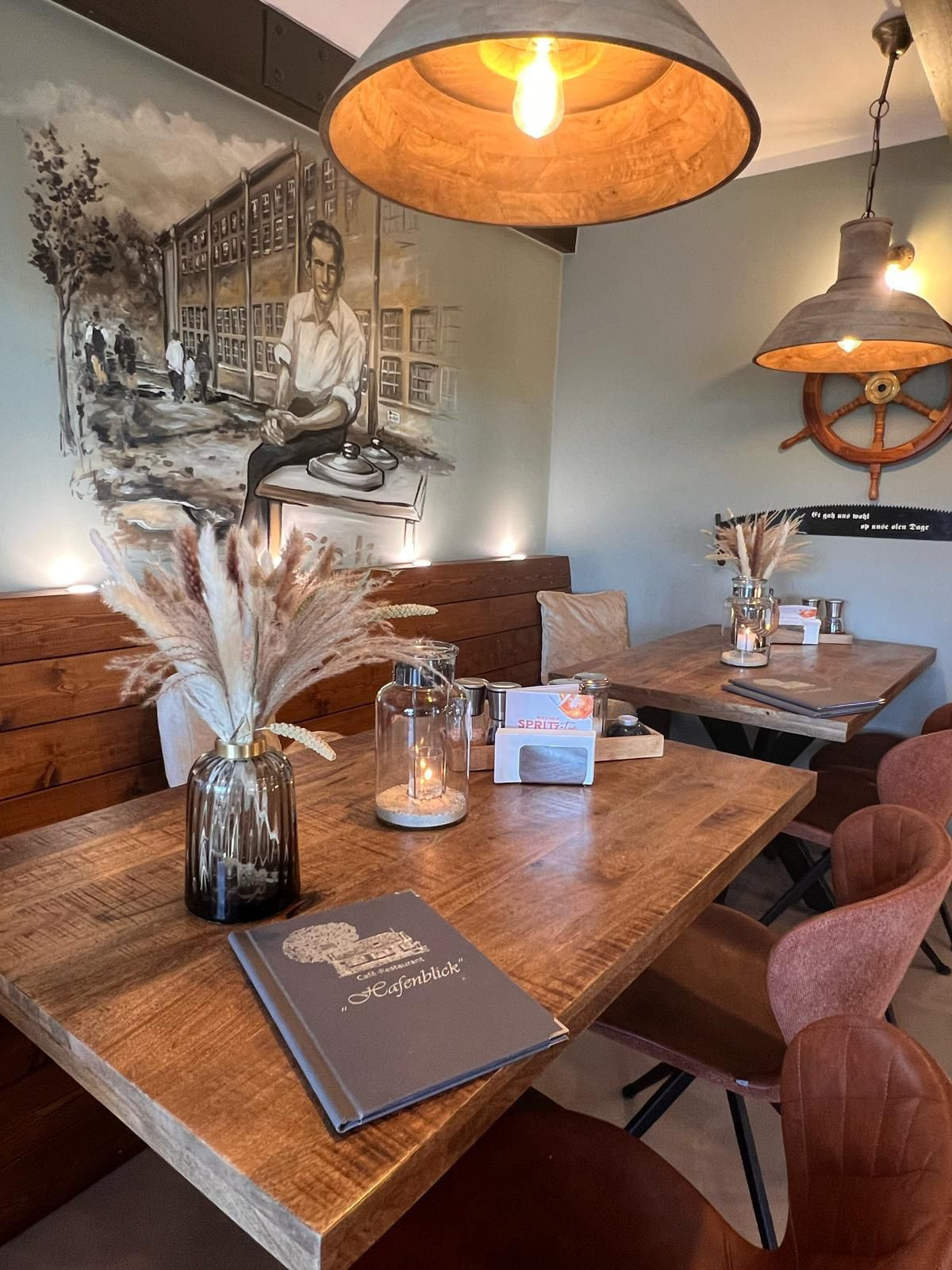 Die Wände der Innenräume sind hell gestrichen, die Farbe changiert zwischen türkis, grau und schilf und sorgt für maritimen Charakter gemeinsam mit dem neuen Fußboden aus einem hochwertigen Harz mit einer hellgrauen Farbe und einer Struktur, die ans Watt erinnert, wenn die Ebbe es freigelegt hat. Ebenso sind die Tische, die Stühle sowie die Lampen neu. Einige, liebgewordene Dekogegenstände haben es dennoch ins neue Café Hafenblick geschafft, zu wertvoll waren die Erinnerungen daran.